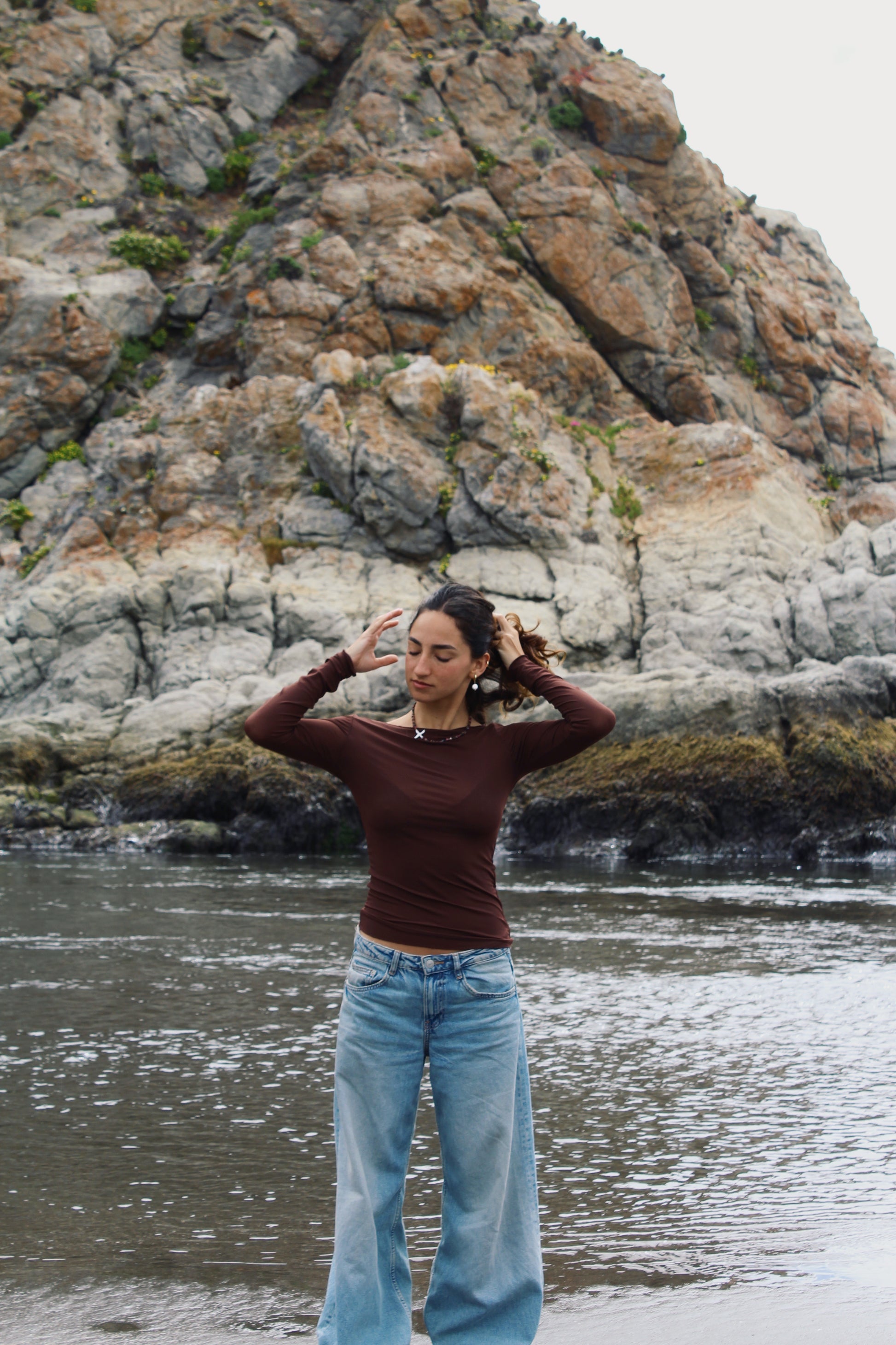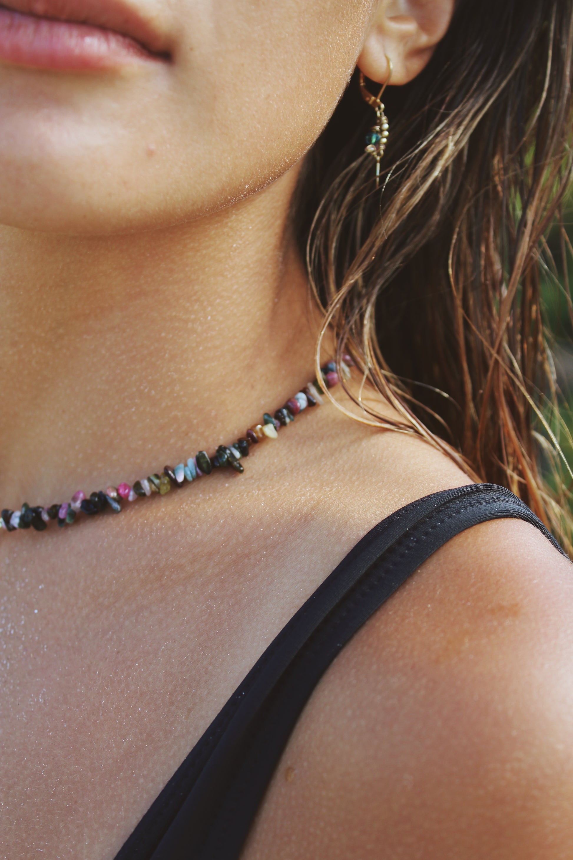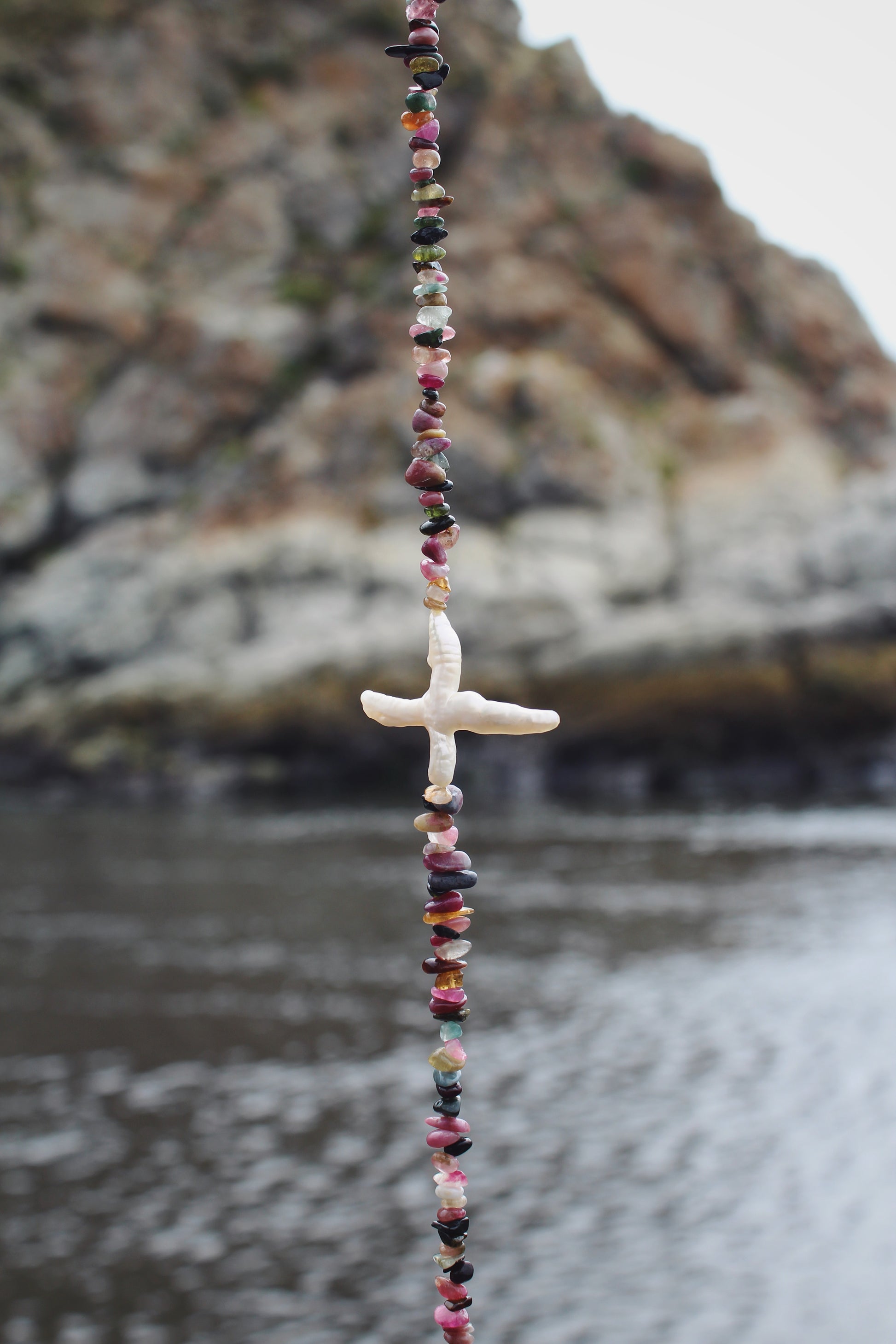 Collar de piedras tipo chips en tonos tierra con perla de río Cruz irregular.